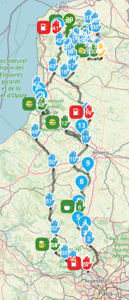 Rendez-Vous à 8h30 sur l'A15 à l'aire de Pierrelaye, station Esso pour un départ à 9h par A15/N104/A16 pour 34km d'autoroute jusque Meru avant d'attaquer 140km à travers l'Oise et la Somme jusque Flixécourt pour une pause casse-croûte. Plein d'essence après déjeuner avant de viroler sur 150km jusque Bomy dans le Pas-de-Calais où nous sommes attendu vers 18h par mon cher cousin pour l'apéritif et le diner. Nous dormirons dans des châlets au "Holiday Village" à Recklinghem à 4km.